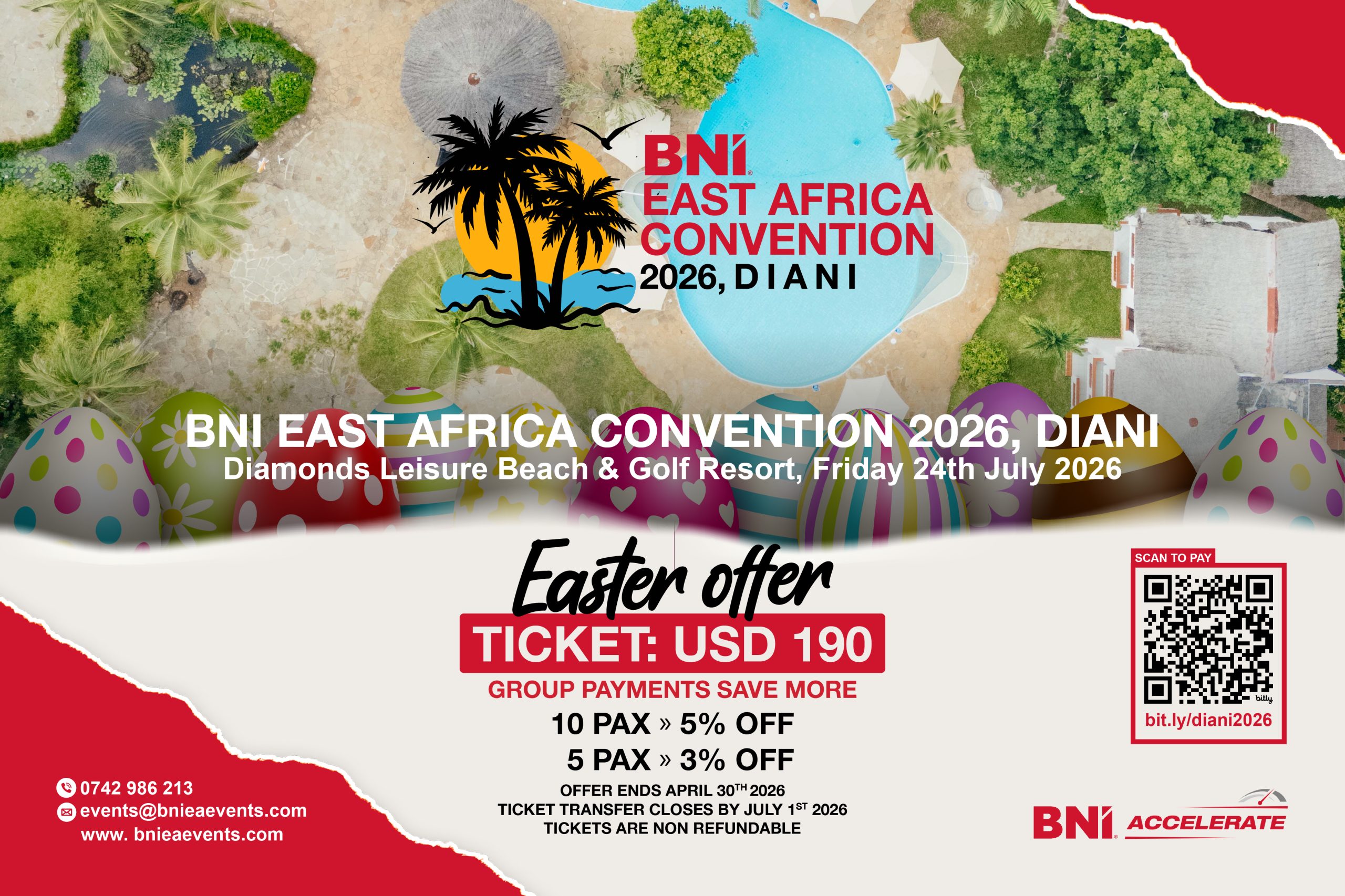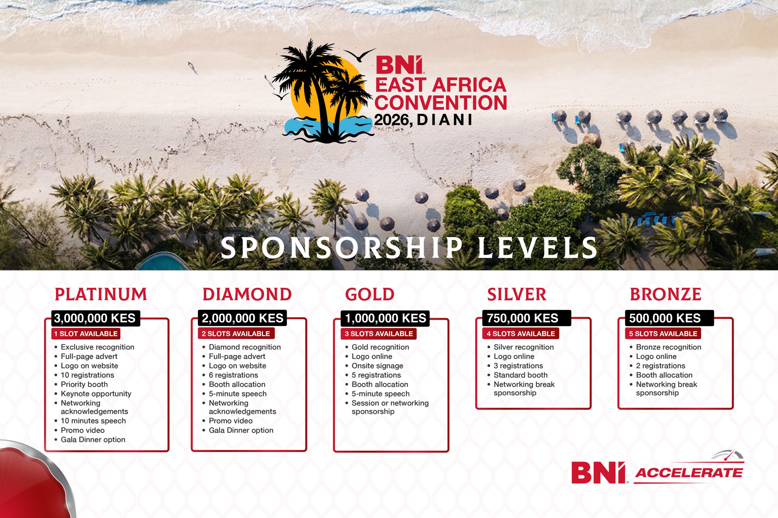 Secure your spot at BNI Accelerate 2026 East Africa's premier business networking convention.